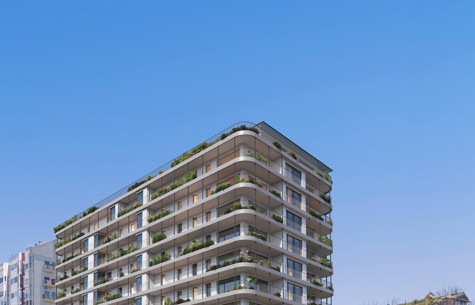 Na linha da frente do mar, com 92 apartamentos (T0 a T5), arquitetura elegante, varandas, acabamentos premium, piscina, ginásio e áreas infantis.